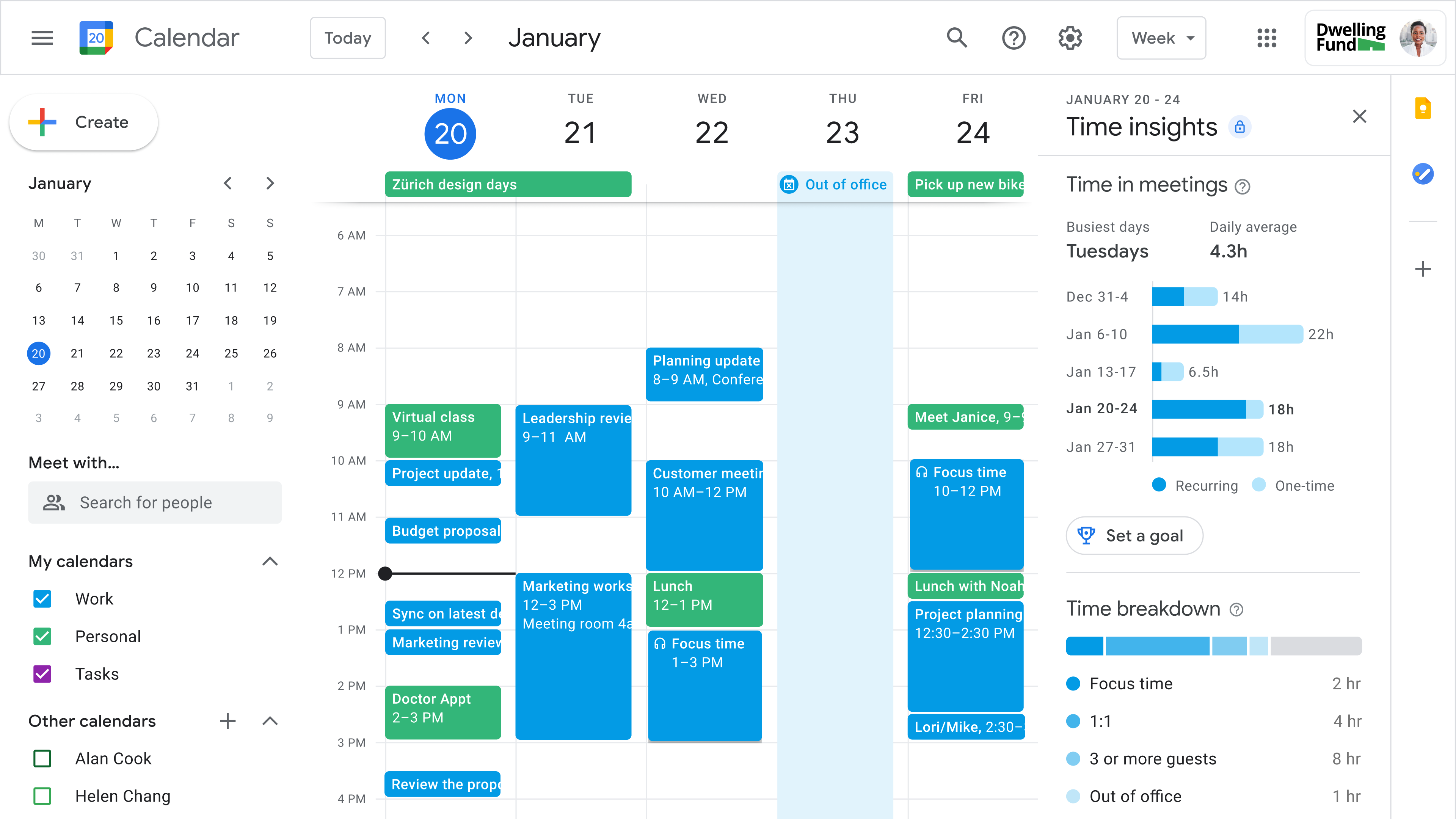 The other new feature that will directly influence your day-to-day work is support for recurring out-of-office entries and segmentable working hours, as well as a new event type, Focus Time, to help you minimize distractions. Focus Time is a bit cleverer than the three-hour blocks of time you may block off on your calendar anyway in that it limits notifications during those event windows. Google is also launching a new analytics feature that tells you how much time you spend (waste) in meetings. This isn’t quite as fully featured (and potentially creepy) as Microsoft’s Productivity Score, since it only displays how much time you spend in meetings, but it’s a nice overview of how you spend your days (though you know that already). None of this data is shared with your managers.