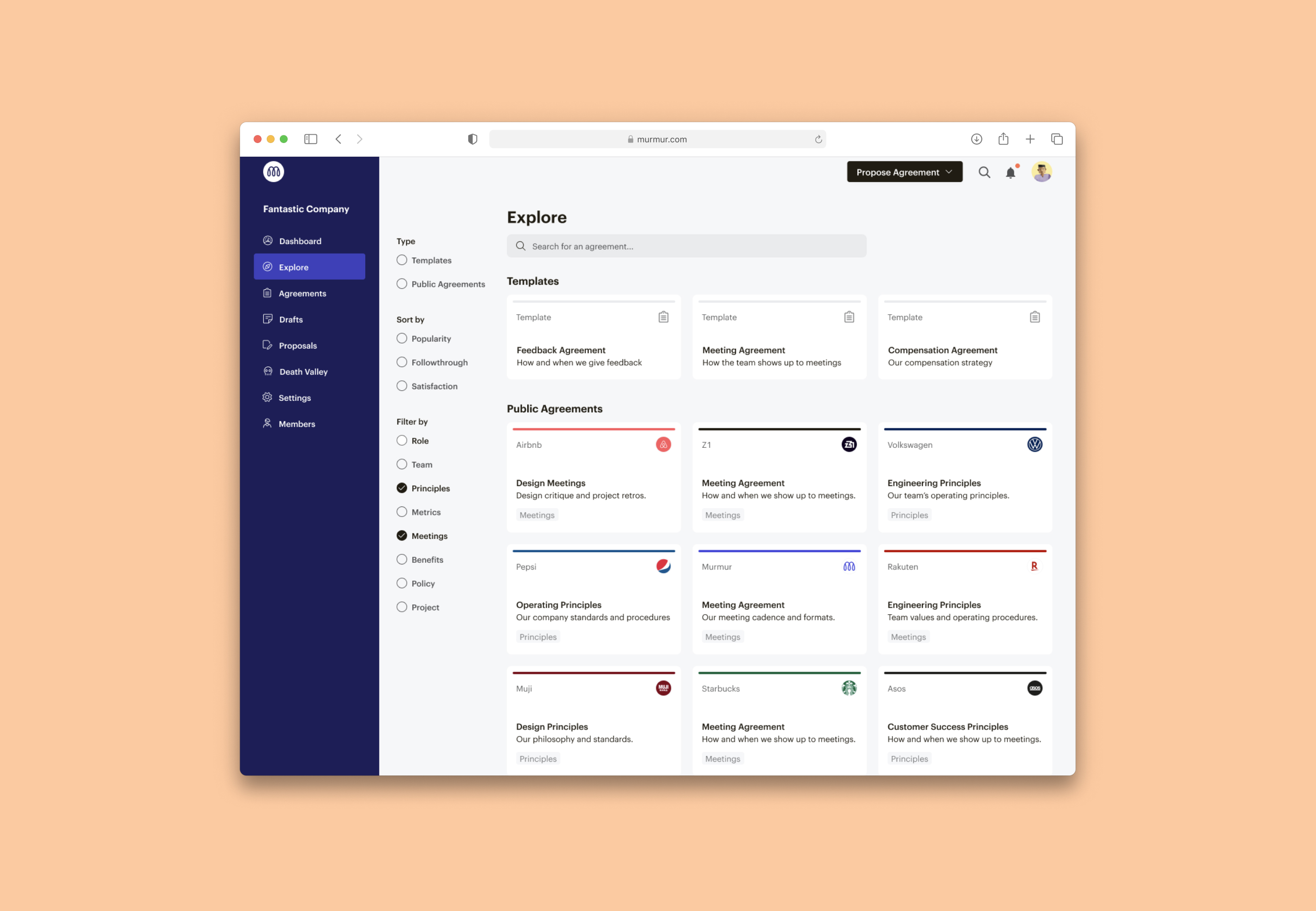 Founded by Aaron Dignan, Murmur helps startups create work agreements based on the policies of other startups. “Work agreements” is an intentionally broad phrase, but encapsulates everything that a team decides about how work works, from paternal leave strategies to strategic priorities to how hiring works.