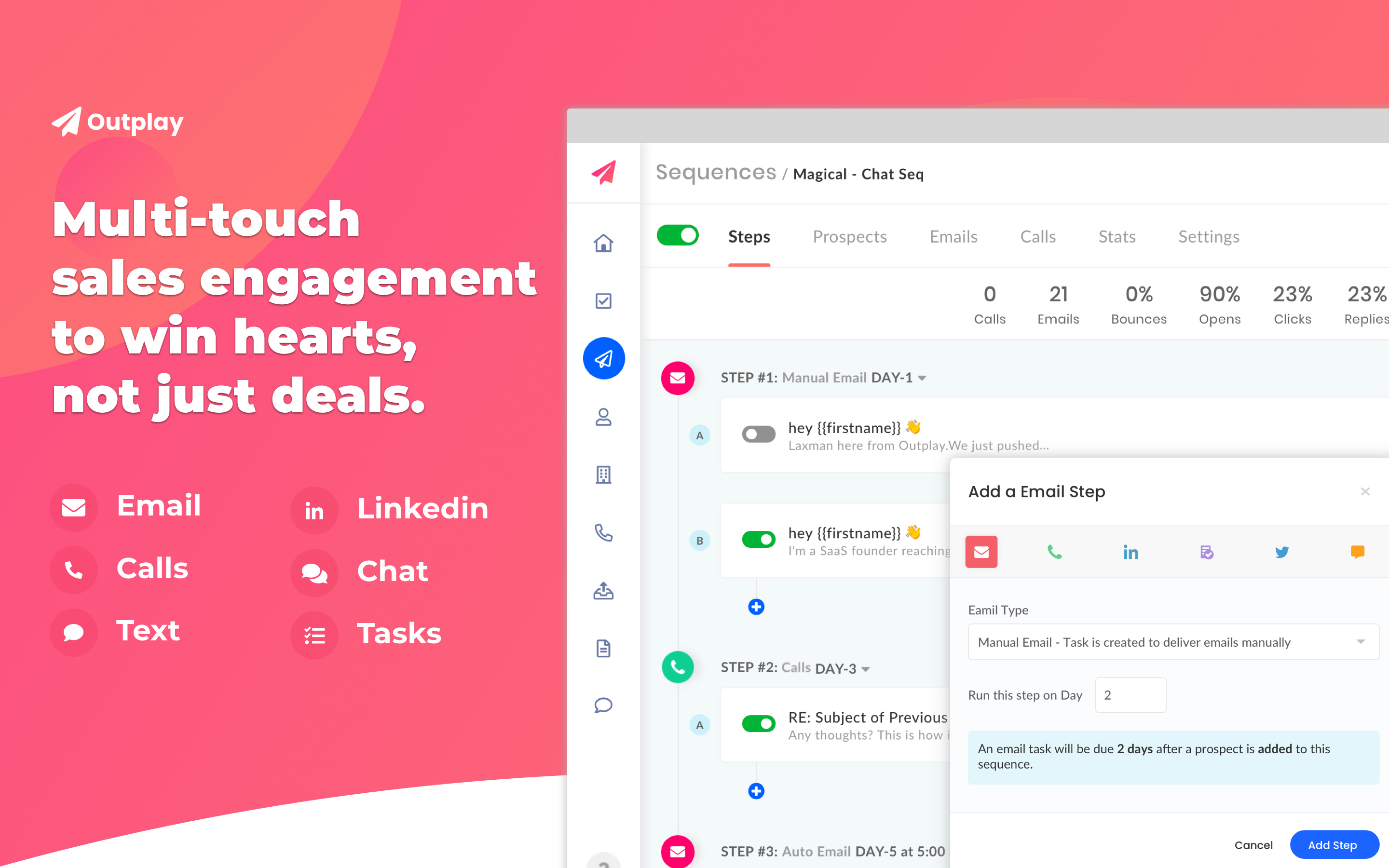 For example, Outplay can be used to create sequences that send initial messages through different platforms, and then automatically follows up with new messages if there isn’t a reply within a pre-set time frame. Outplay also provides analytics to help sales people track how well sales campaigns are working.