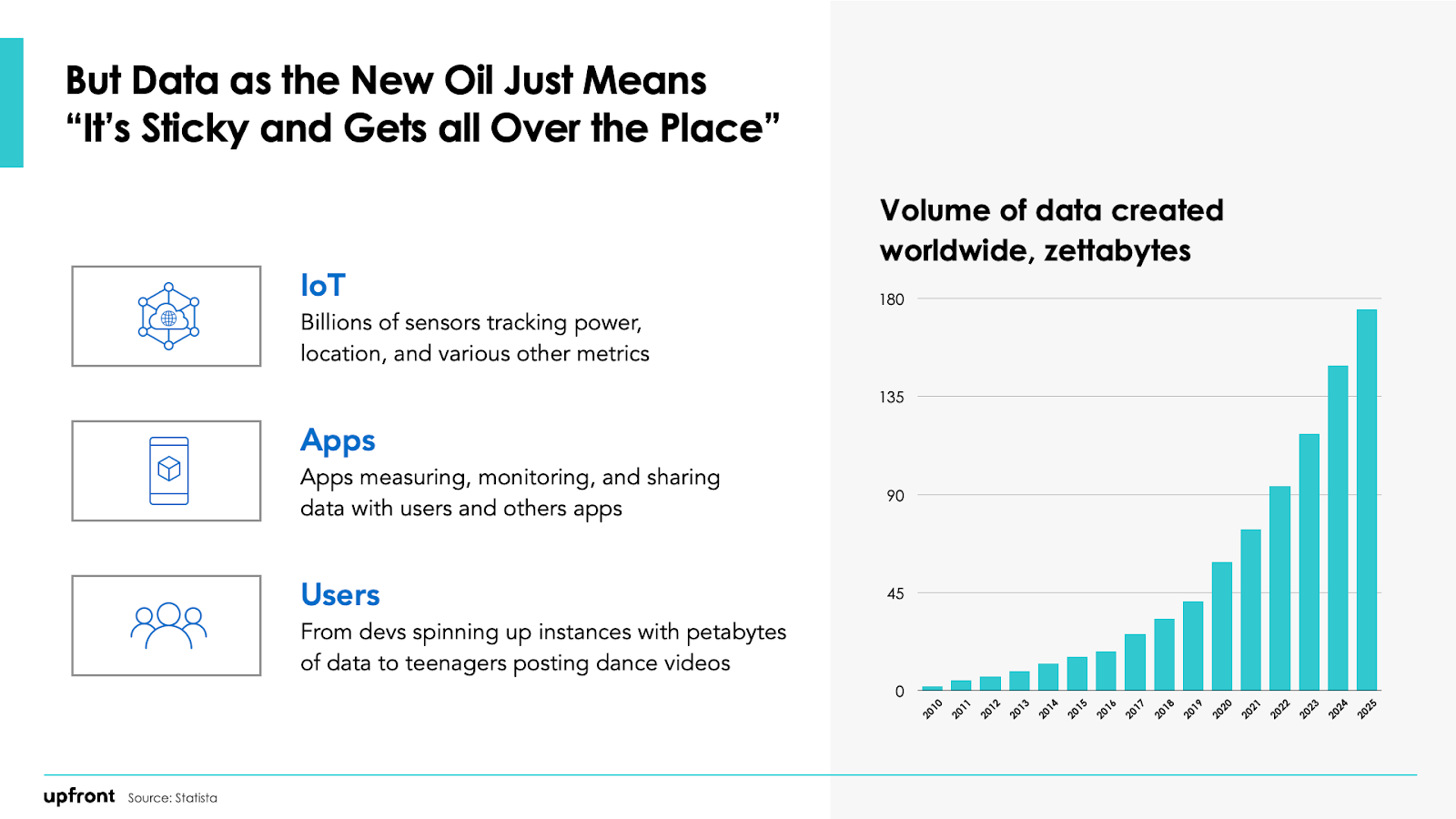 Of course — data makes us smarter. But with this proliferation, we’re seeing the downside of all of this data, or what Nick Halstead, founder of InfoSum (and Upfront Portfolio Company) observed about “data as oil”: “It’s sticky and gets all over the place.” As I’ve written before, improperly storing data isn’t new. What is new(ish) is how security is made harder by the immense quantity of data that exists and all of the different places you can put it.