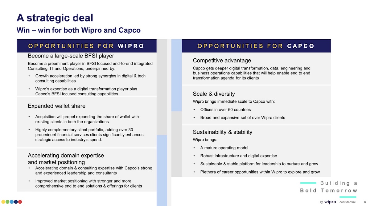 “Together, we can deliver high-end consulting and technology transformations, and operations offerings to our clients. Wipro and Capco share complementary business models and core guiding values, and I am certain that our new Capco colleagues will be proud to call Wipro home,” said Thierry Delaporte, CEO and managing director of Wipro, who assumed the top role last year.