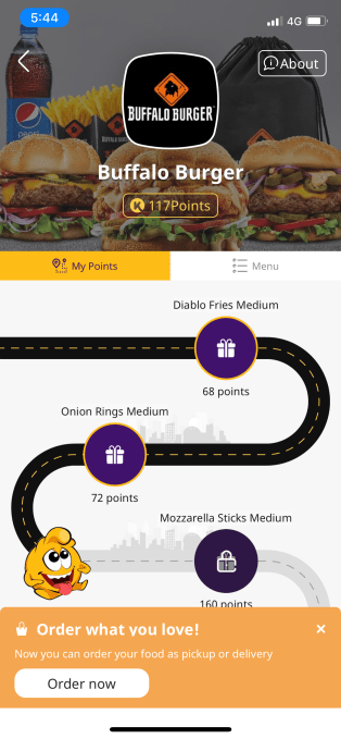 Brands can configure their gifts lists and determine for which items customers can redeem their points. For instance, customers in an Egyptian restaurant called Buffalo Burger can exchange 68 points for a Diablo Fries Medium; or wait till they get to 160 points to get a Mozzarella Sticks Medium; or 236 points for a Double Diggler.