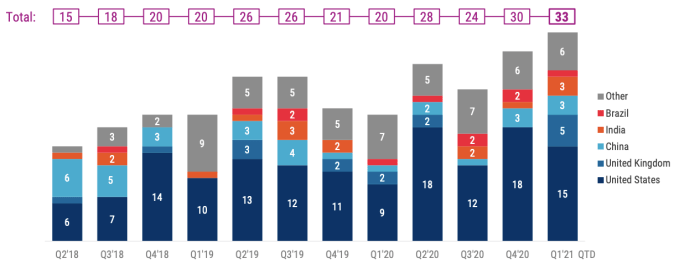 The United States made up less than half of the number — unlike in prior record-setter Q4 2020 — with the U.K. coming in second, followed by China, India, Brazil, and a number of countries detailed as “Argentina, Australia, Canada, France, Germany, Hong Kong, Indonesia, Israel, Italy, Mexico, Netherlands, Nigeria, Singapore, South Korea, Sweden, Uruguay, and Vietnam” thus far in the first quarter.