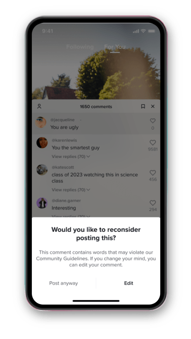 The other feature will instead push users to reconsider posting bad comments — meaning those that appear to be bullying or inappropriate. It will also remind users of TikTok’s Community Guidelines and allow users to edit their comments before sharing.