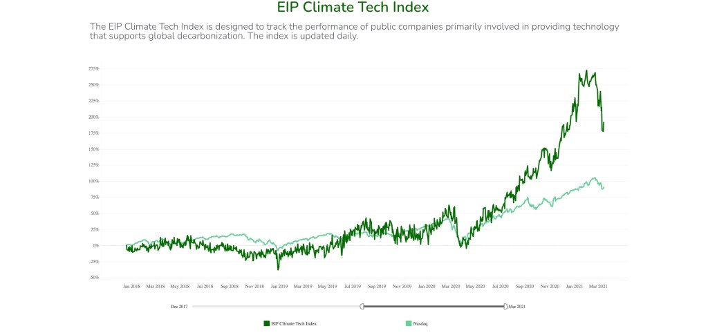 Given the deluge of climate focused companies flooding public markets, it’s getting hard to keep track of who’s doing what, where they’re traded and how they’re performing. That’s why the folks at Energy Impact Partners have set up an index tracking tech companies that are focused on sustainability, energy efficiency and reducing greenhouse gas emissions.