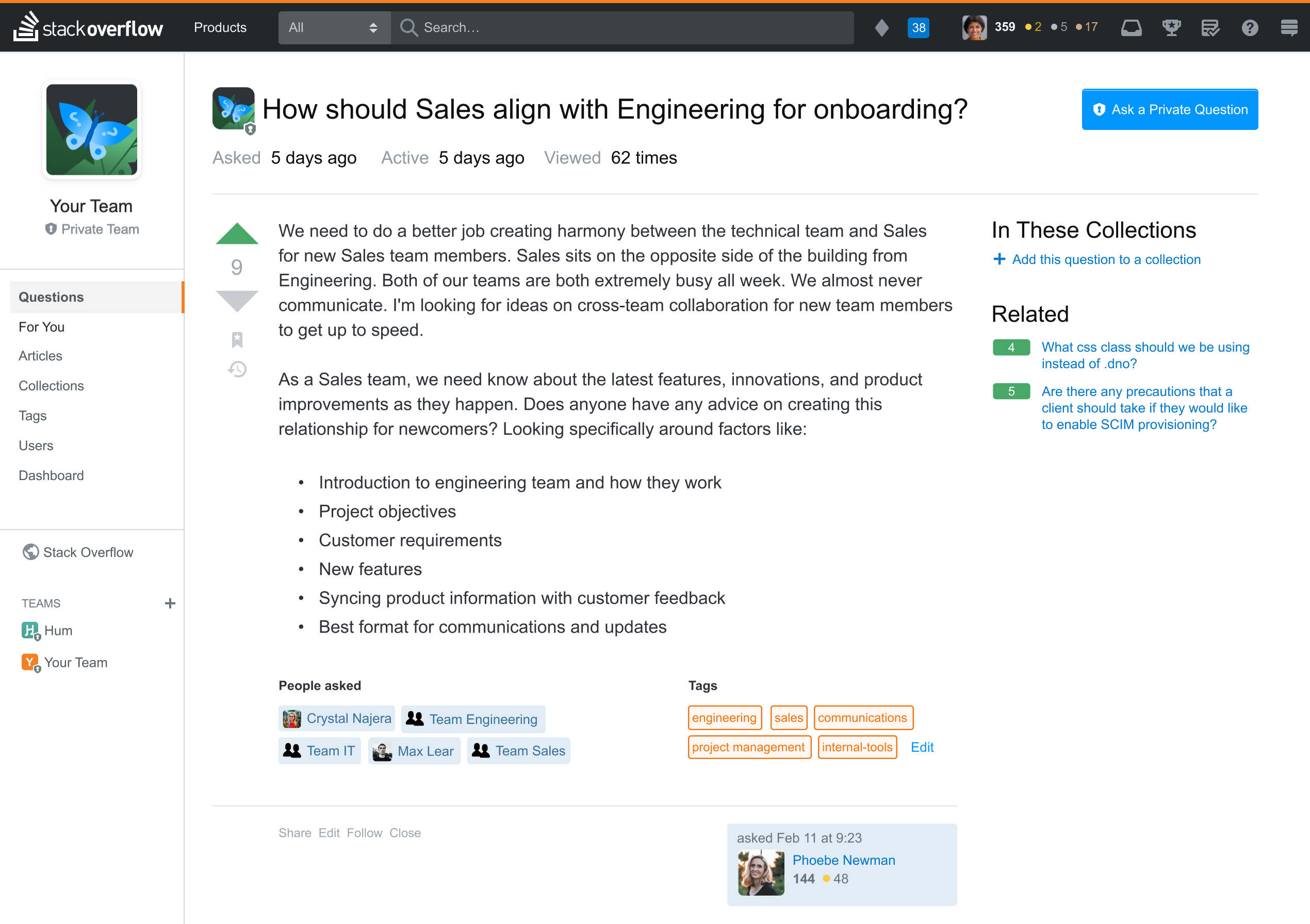 Some of the missing features, however, are access to Stack Overflow for Teams’ Articles format for longer-form content and Collections, a feature that allows users to group together sets of similar questions that can be used for an onboarding workflow or in place of a traditional FAQ document, for example. Stack Overflow CPO Teresa Dietrich tells me that the company has seen over 50% adoption of Articles since its launch in August 2020. The company also recently introduced a private feedback option for Teams.