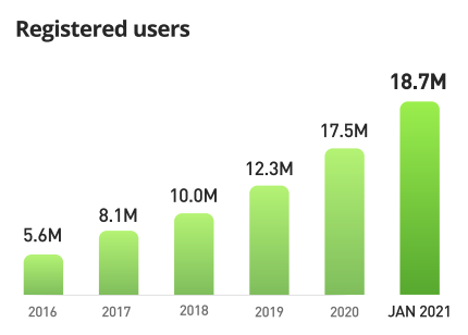 Impressive, right? eToro later breaks the 2020/2021 split into numbers, noting that it recorded an average of 192,000 registrations per month in 2019, 440,000 per month in 2020 and 1.223 million in January 2021. The implication the company is trying to impart on investors is obvious: If you like our past growth, just look at what this teaser 2021 data point could mean!