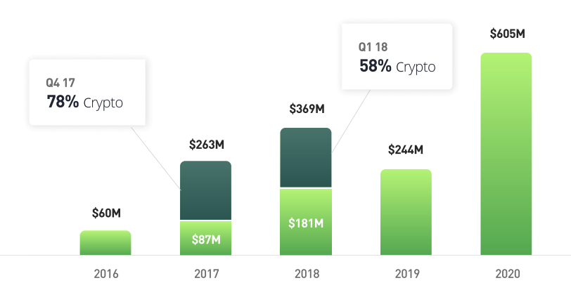 The company’s blended asset-based revenue — both trading incomes and interest — has changed its base over time. In 2017, 63% of eToro’s revenue from trading and interest came from crypto assets. By 2020, it was 32% from commodities and 44% from stocks. What drove the large crypto incomes? The 2017/2018-era bitcoin mania.