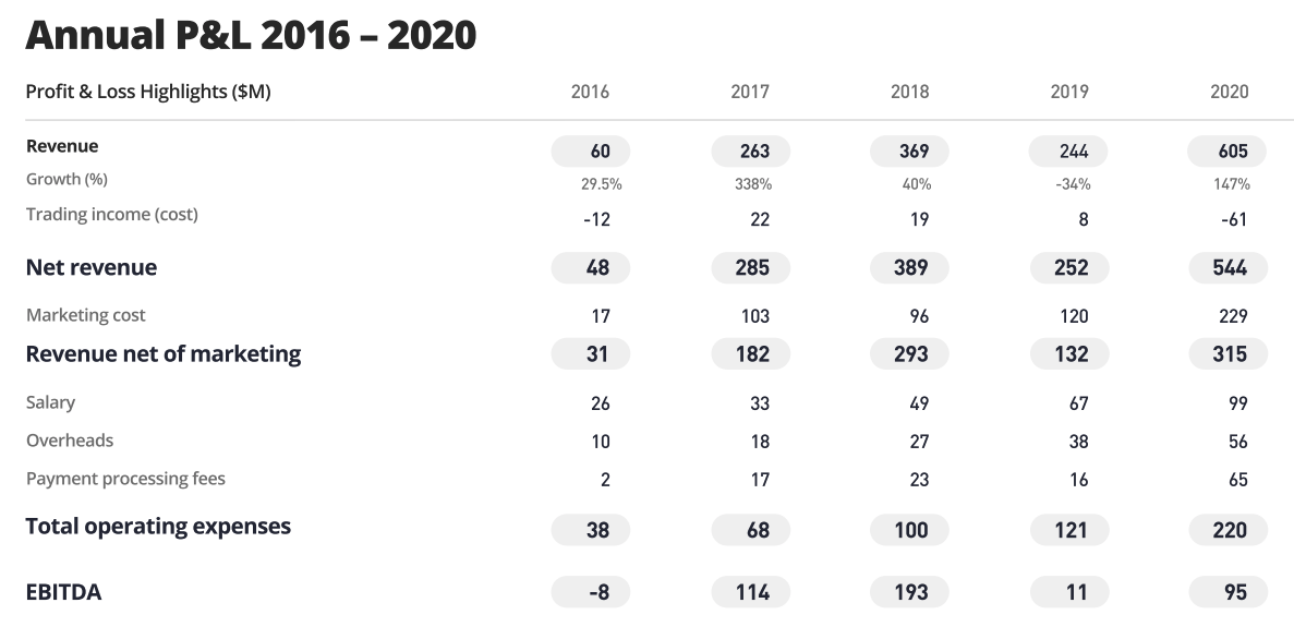 Even when eToro saw its revenues fall in 2019, it still managed to generate unadjusted EBITDA! Not bad indeed. While the company’s 2018 profits were not beaten in 2020, the company’s growth was impressive enough that investors probably won’t mind, given the present-day markets climate that favors growth over other metrics.