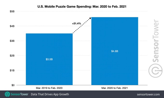 U.S. mobile puzzle game spending jumped 30% YoY to $4.6 billion in 2020, per a Sensor Tower report. The pandemic likely contributed to the rise, with top game Candy Crush Saga pulling in $643 million following by Homescapes and Gardenscapes.