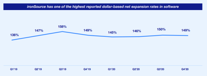 How does the company intend to grow at nearly 40% in the next two years? Rapid expansion among its existing accounts. In software-accounting terms, ironSource has strong net expansion, hovering around the 140% to 150% mark: