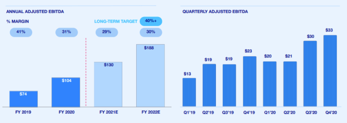 First of which: Why did the company’s adjusted EBITDA profit margin shrink so much from 2019 to 2020, falling from 41% to 31%? And ironSource anticipates further declines to 29% in 2021 before a modest improvement to 30% in 2022. As it scales, it anticipates more gross adjusted EBITDA, but it will take a long time for the company to get close again to its long-term target of 40% adjusted profit margins.
