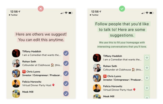 Clubhouse has clearly adopted a similar methodology, by pre-selecting 50 people for you to follow while signing up.