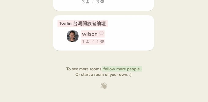 On Clubhouse, once you’ve scrolled past all the available rooms in your feed, you’re prompted to follow more people to see more rooms. In other words, Clubhouse is inadvertently describing how it decides what content you see, i.e., your homepage is a curated list of rooms based on people you follow.