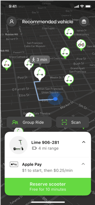 To use the feature, customers need to scan a QR code with their camera app, which connects to Apple’s App Clips or Android’s Instant App features. Customers can then confirm the ride and use Apple Pay or Google Pay to start riding. Technically, users are actually downloading a sliver of the app — only 10 megabytes versus 100 megabytes for the full app, and only for eight hours. To the average rider, it just appears as if they’re opening a file or app on their phone, which is a lot quicker than downloading the app, creating an account, adding a payment method and reading a tutorial, which takes about five minutes rather than 30 seconds.