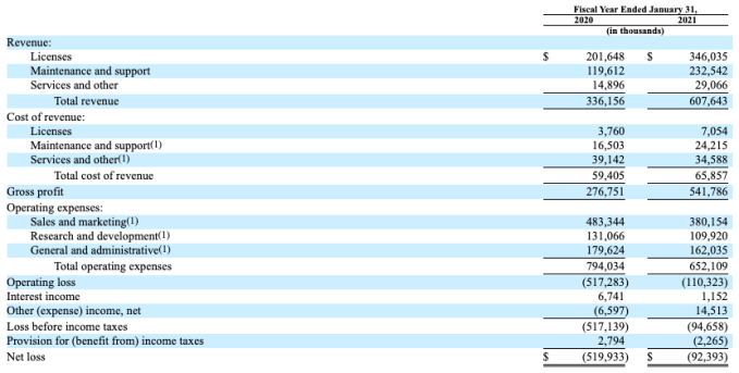 To avoid forcing you to flip between the filing and this piece, here’s UiPath’s income statement for its fiscal years that roughly correlate to calendar 2019 and calendar 2020: