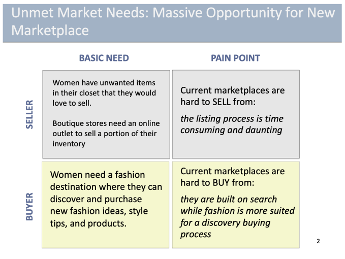 The problem was straightforward. The listing process for sellers was complicated and difficult on platforms like eBay, and the buying process was based on direct search, rather than discovery. Poshmark was equally straightforward about this problem in the deck.