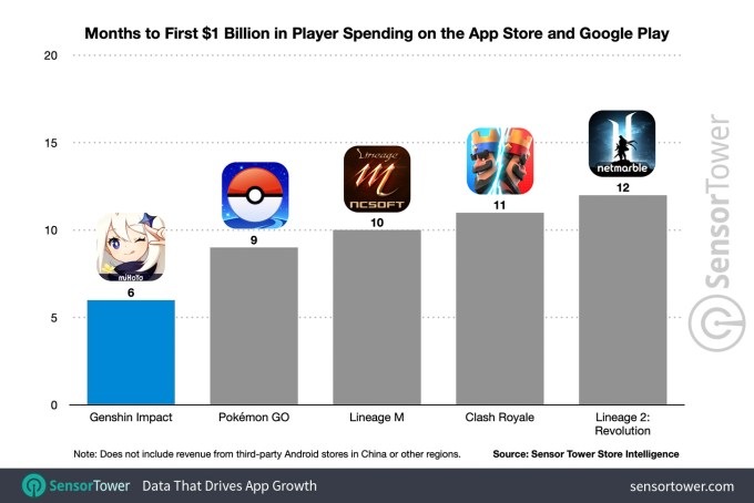 Genshin Impact tops $1 billion on mobile in less than six months following its September 2020 launch, says Sensor Tower. During the last 30 days, the game ranked No. 3 on the App Store and Google Play combined, behind Tencent’s PUBG Mobile and Honor of Kings.