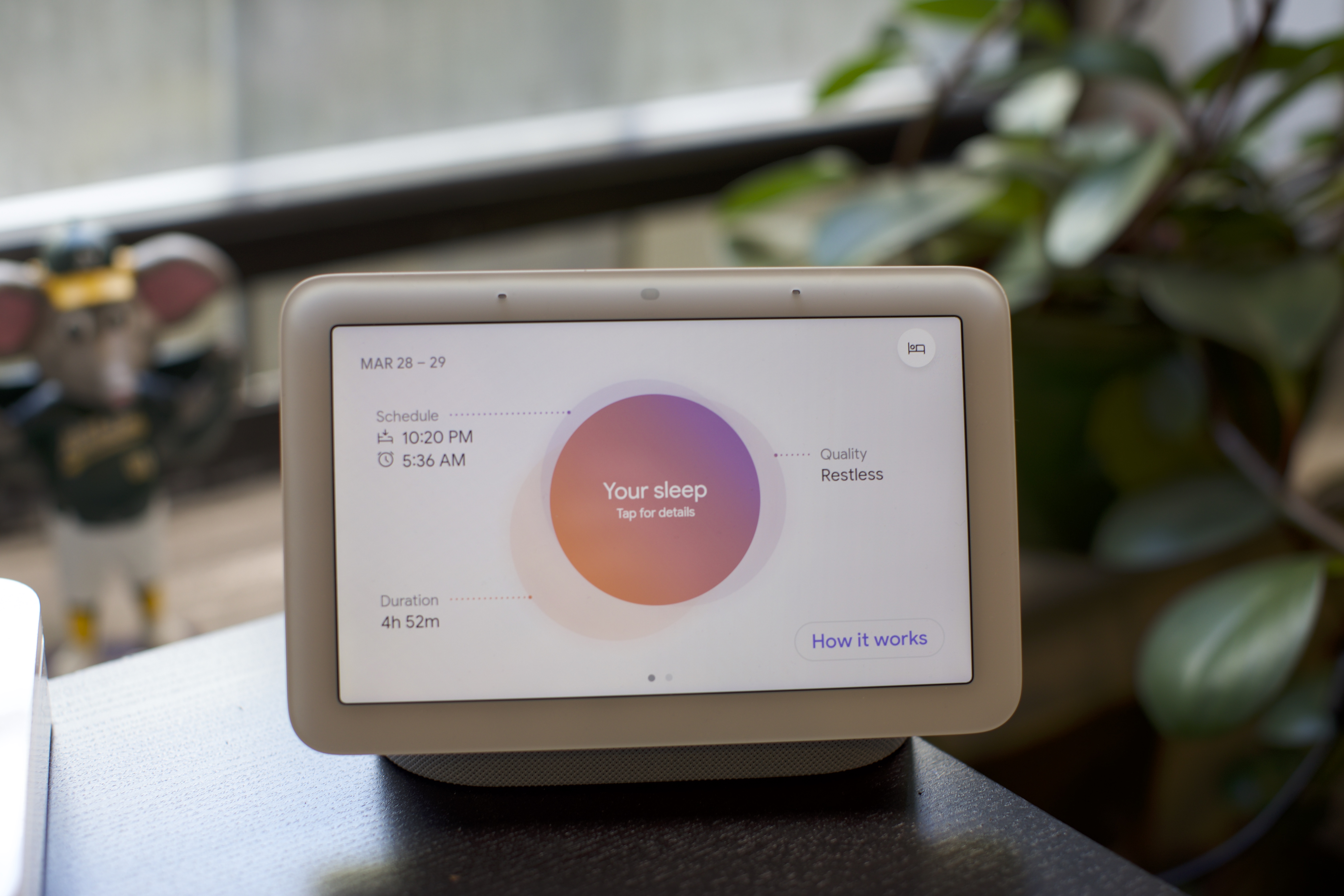 Sleep Sensing uses Motion Sense to track the sleep of the person closest to the display. With a low-energy radar, Motion Sense detects movement and breathing. Other sensors in Nest Hub detect sounds like snoring and coughing, and environmental factors like light and temperature in the room. That’s how Sleep Sensing determines not just when you went to bed and how long you slept, but also the quality of your sleep.