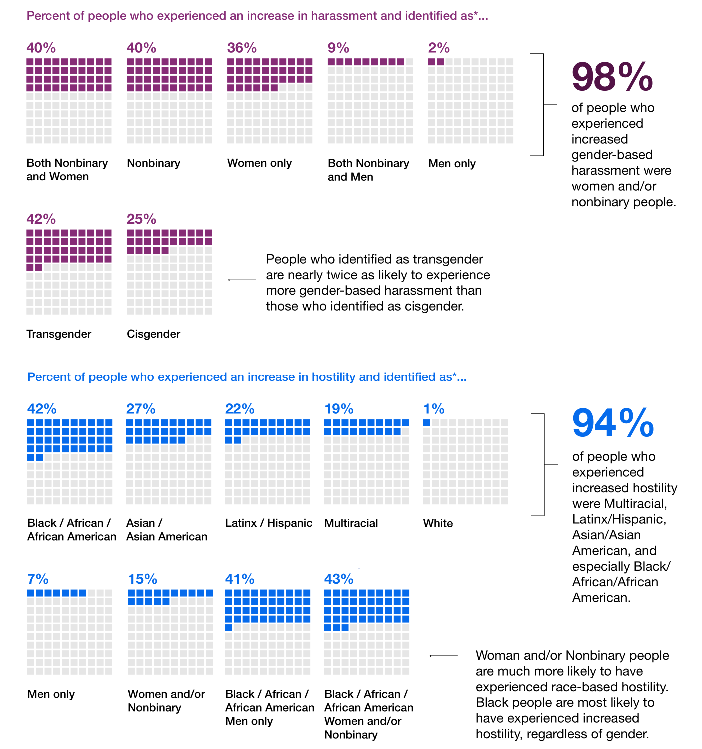 Remote work has changed how people interact, and the result of that has been, among other things, significant increases to gender- and race-based harassment. Over a quarter of those surveyed reported an increase in harassment and workplace hostility — and of those experiencing increases, 98% were women or nonbinary and 99% were nonwhite.