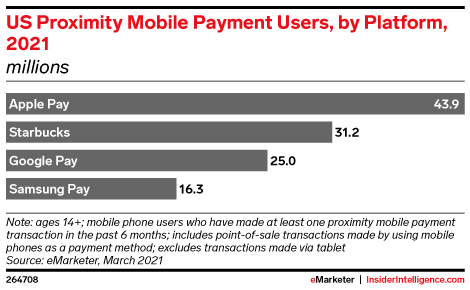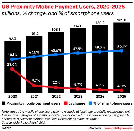 Last year, 92.3 million U.S. consumers age 14 or older used proximity-based mobile payments at least one time during a six-month period in 2020 — a figure the firm expects to grow to reach 101.2 million this year. And that usage is now on track to surpass half of all smartphone users by 2025, eMarketer forecasts.