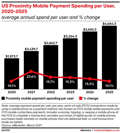 As a result of the industry changes, eMarketer reports that not only has mobile wallet usage increased, the average annual spend per user is increasing, as well. The firm predicts that figure will grow 23.6% from ~$1,973.70 in 2020 to $2,439.68 in 2021, and will surpass $3,000 by 2023.