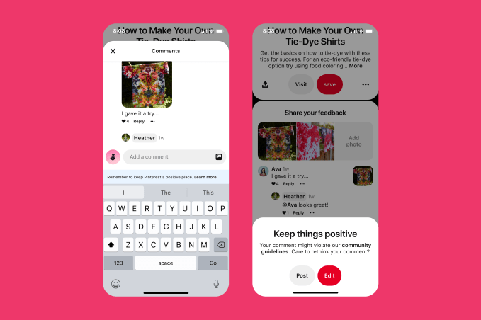 Also new are “positivity reminders,” which will pop up asking Pinterest users to reconsider before posting potentially offensive comments. The notification will push users to go back and edit their comment, but doesn’t prevent them from posting.