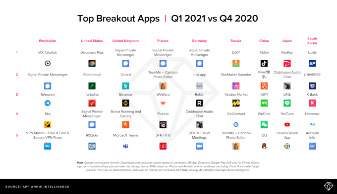 It can be difficult to determine which apps are driving these changes as the most downloaded apps tend to remain the same quarter after quarter. The top charts are dominated by the usual names like TikTok, YouTube and Facebook, for example. That’s why App Annie now tracks what it calls “breakout apps,” which are those that saw spikes in quarter-over-quarter downloads across both iOS and Android.