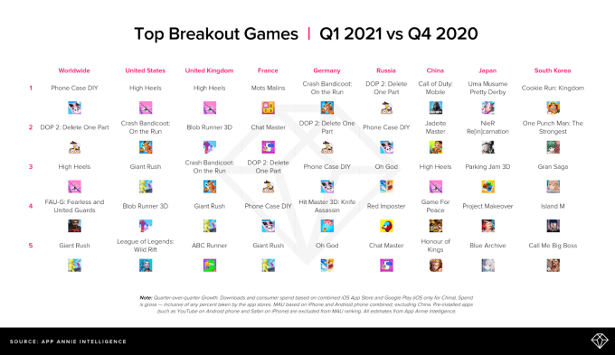 TikTok’s influence on games was also apparent in the quarter. The game High Heels from Istanbul-based Rollic (now owned by Zynga), was heavily advertised on TikTok, sending the title to No. 1 in the U.S. and U.K.’s “breakout” games charts, as well as No. 3 in China, No. 7 in Germany and No. 6 in Russia.