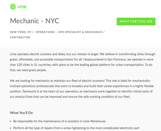 Lime is no stranger to NYC. Its e-bikes have historically had a presence in The Rockaways, Queens. Now it has two job postings up — for a mechanic and an operations specialist — that specifically mention management, maintenance, deployment and retrieval of Lime’s e-scooters.