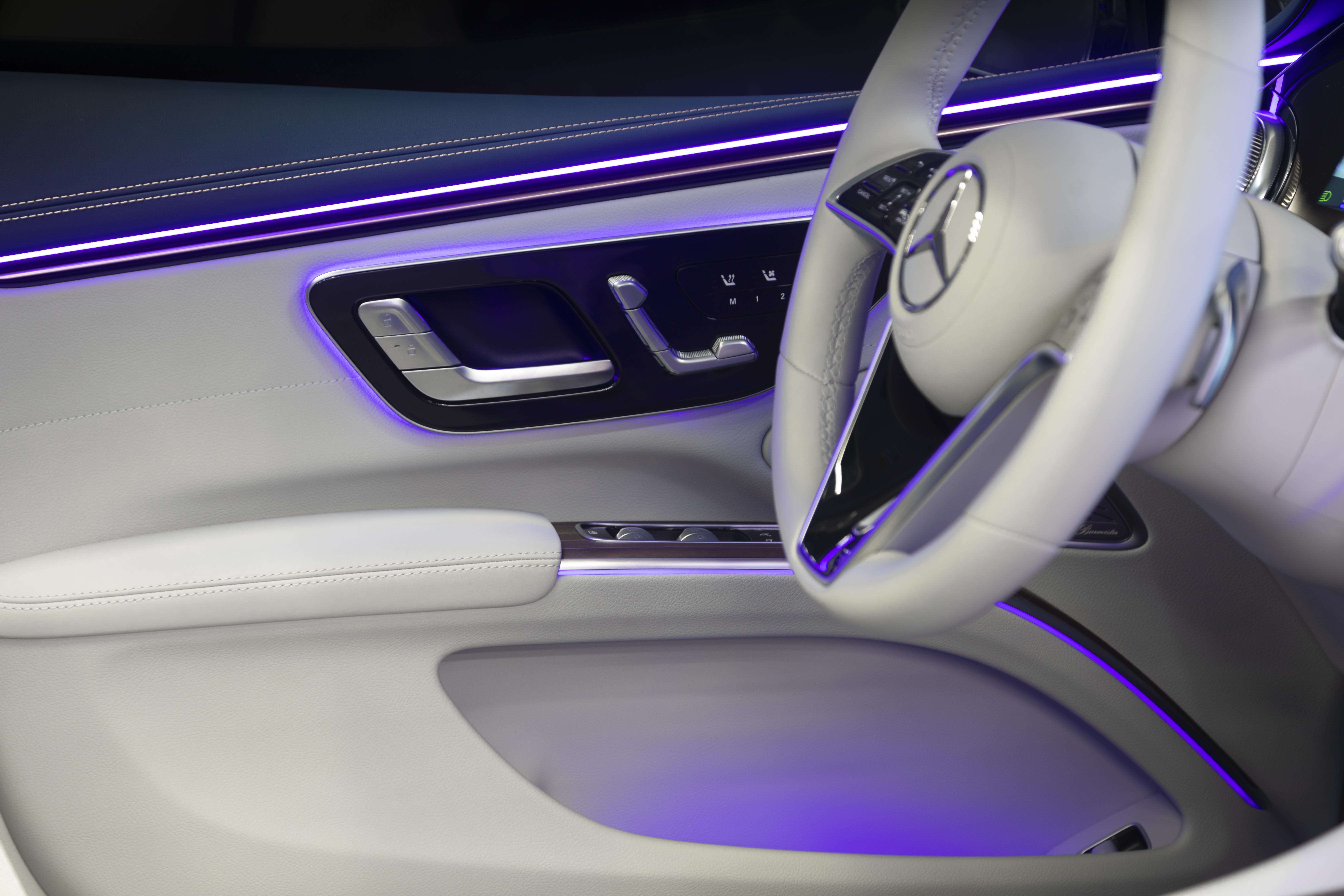 My five-year-old daughter accompanied me on the test drive. We started at the Mercedes Manhattan dealership, where EQS was displayed in the store window. As I approached the car, the driver door automatically swung open with great fanfare. From the vantage point of her booster seat, my daughter played with the rear screen that hovered in front of her. She selected ambient lighting in pink and purple hues for the cabin. Her top takeaway: “It’s a sparkly rainbow ride.”