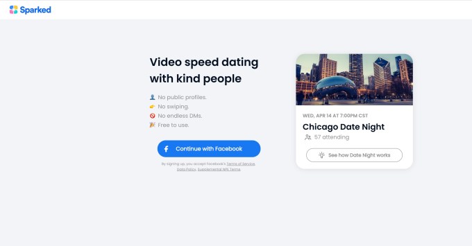 Facebook confirmed it’s testing a video speed-dating app called Sparked, after the app’s website was spotted by The Verge. Unlike dating app giants such as Tinder, Sparked users don’t swipe on people they like or direct message others. Instead, they cycle through a series of short video dates during an event to make connections with others. The product itself is being developed by Facebook’s internal R&D group, the NPE Team, but had not been officially announced.