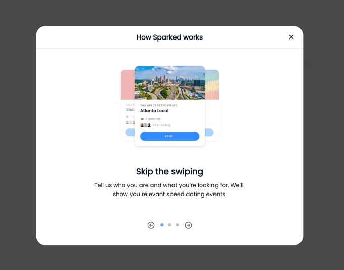 During the sign-up process, Sparked tells users to “be kind,” “keep this a safe space” and “show up.” A walkthrough of how the app works explains that participants will meet face to face during a series of four-minute video dates, which they can then follow up with a 10-minute date if all goes well. They can additionally choose to exchange contact info, like phone numbers, emails or Instagram handles.