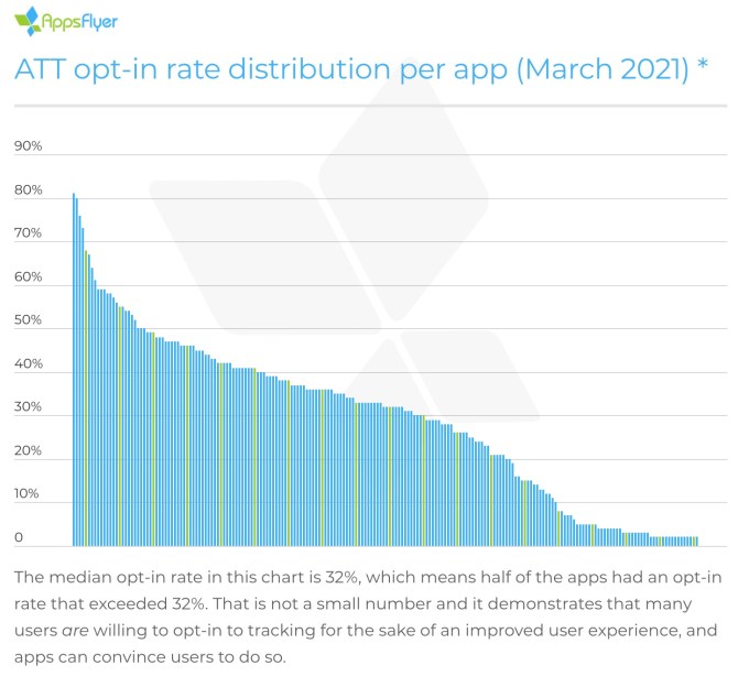 But an AppsFlyer study found that opt-in rates for being tracked were much higher than anyone would have expected. The industry was forecasting opt-in rates anywhere from 2% to 20%, but were figuring things would more likely be in the single digits. So imagine everyone’s surprise when AppsFlyer found that opt-in rates were at a 28% average per app and a median of 32% (meaning about half the apps were exceeding 32%!).