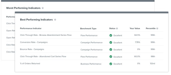 Finally, Klaviyo is in the process of rolling out a new set of data features, such as using anonymized data from across its customer base. The first such feature, called Benchmarks, compares a user’s performance to a hundred of its closest peers on metrics like email open rate and revenue per message, giving marketers insights on how their campaigns and flows stack up competitively.