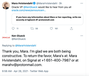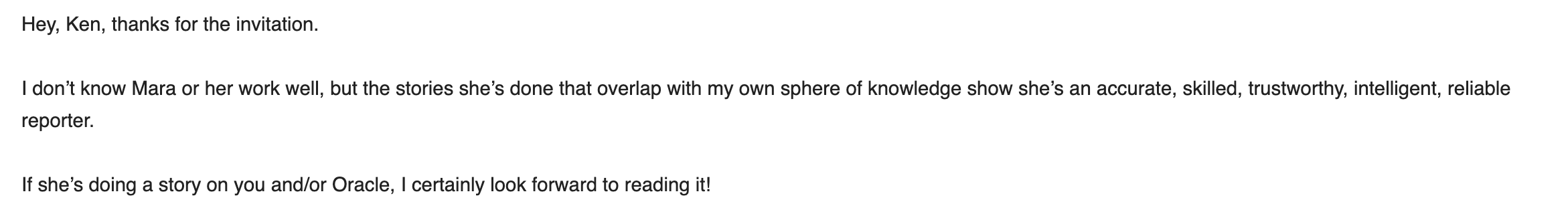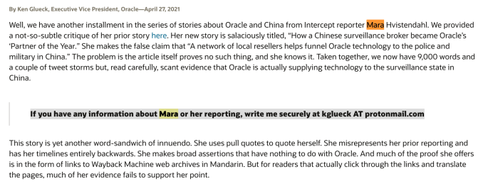 Rule number two: Don’t attack reporters; attack (if you must) the outlet. In Glueck’s first diatribe against The Intercept over its February piece, he mentions the outlet 26 times and the author of the piece once. In Glueck’s newest salvo against The Intercept, he refers to its author, reporter Mara Hvistendahl, 22 times — mostly by her first name — and even invites readers of Oracle’s blog to reach out to him about her, writing in boldface: “If you have any information about Mara or her reporting, write me securely at kglueck AT protonmail.com.”