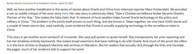 Rule number one: Don’t draw attention unnecessarily to work that you might prefer didn’t exist. Oracle’s newest post doesn’t link back to the new Intercept story that Glueck works to dismantle, but in an earlier post about the first Intercept story that ran in February, Glueck hyperlinks to the story on Oracle’s blog in the very first sentence of his response, even sharing its intriguing title: “How Oracle Sells Repression in China.”
