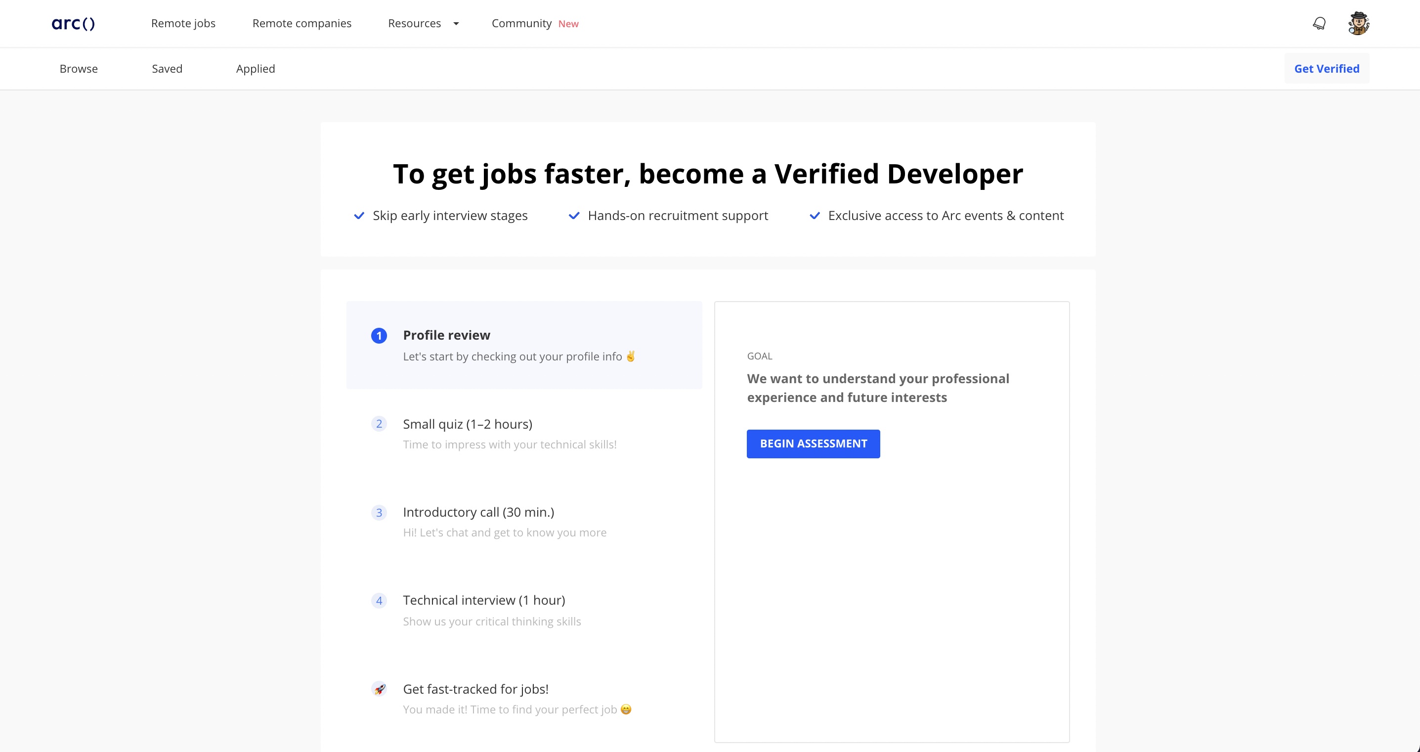 Even though it is now optional, Arc still recommends its verification process. It typically takes about a week, and includes a coding challenge and behavioral and technical interviews with an Arc team member. Even if someone doesn’t pass, they get feedback about where they can improve and can reapply in six months. Verification and job searches are free, and Arc monetizes by charging employers for hires through its platform.