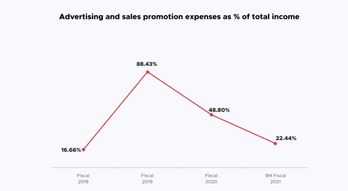 You can see the “investment” period there in fiscal 2019, and the resulting reduction in promo spend as a percentage of revenue over time. A good question is this: How much more can the company push down that ratio? Every rupee not spent on promotional costs is a rupee that could wind up helping the company end its history as a cash-burning entity.