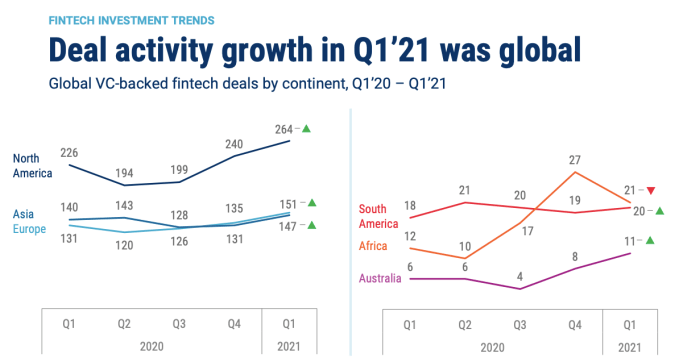 So no continent was a slouch, really, in the quarter. The disparity in results, however, is blunt. North America, home to the robust U.S. venture capital scene, saw 264 fintech rounds in the first quarter of 2021. Asia and Europe managed around 300 as a pair, effectively tying in the period at around 150 apiece.