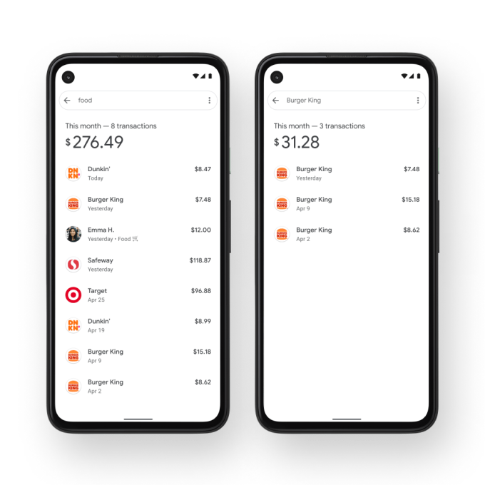 As a part of that experience, Google Pay users will now gain better access into their spending behavior, balances, bills and more via an “Insights” tab. Here, you’ll be able to see what your balance is, what bills are coming due, get alerts about larger transactions, and track spending by either category or business. As Google is now automatically categorizing transactions, that means you’ll be able to search for general terms (like “food”) as well as by specific business names (like “Burger King”), Google explains.