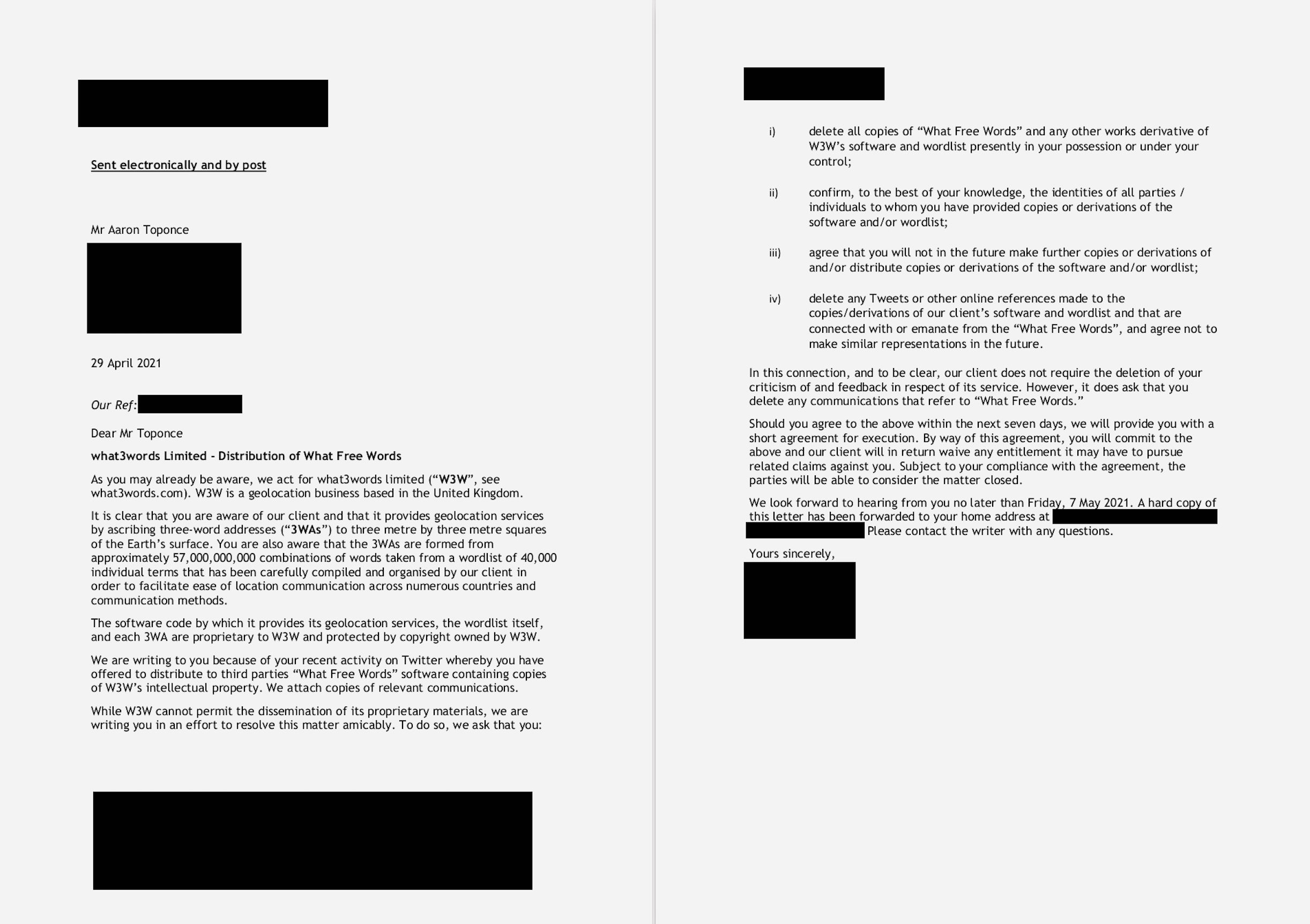 The letter gave him until May 7 to agree, after which What3Words would “waive any entitlement it may have to pursue related claims against you,” a thinly-veiled threat of legal action.