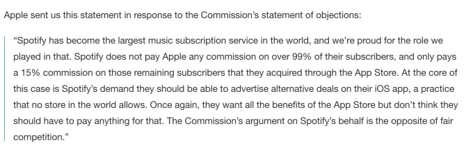 Apple is correct in pointing out that Spotify has built a massive business — which to be fair, was built both on and off the App Store. But it’s claiming a pretty big hand in that. The EU’s belief, meanwhile, is that Spotify might have been even more successful if Apple hadn’t imposed the restrictions it did, and that other smaller, streaming competitors are being harmed, too, but don’t have the power to speak up.