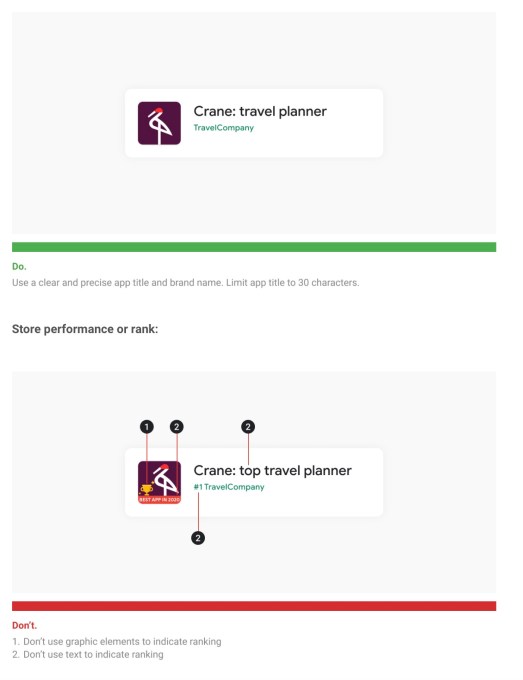 Google says it’s updating its Google Play policies for app developers to improve app quality and discoverability. Now banned is keyword stuffing in the app’s title for ASO purposes. Titles will now be limited to 30 characters and can’t use keywords that imply store performance, or promotion in the icon, title or developer name. Icons that mislead users will also be banned. Emoticons and emoji can also no longer be used. The company is additionally cracking down on preview assets to ensure they accurately represent the game or app and give users enough information to make a decision to download. They can’t use words like “free” or best” either, and must be localized and legible.