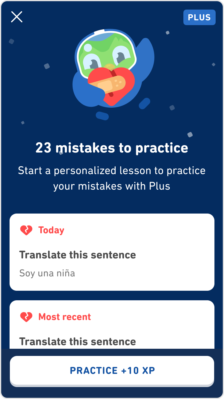 Duolingo would end up piggybacking off of Tinder’s branding, launching Duolingo Plus at the same price point. Months after von Ahn wrote his first blog post about monetization at Duolingo, he announced the new premium service, which was rolled out first on Android. The monthly subscription option offered the ability to remove advertisements as well as download lessons for offline use. Eventually, Duolingo Plus included a monthly streak repair, unlimited hearts, skill test-outs, and a progress and mastery quiz. Users were offered a 14-day free trial before subscribing.