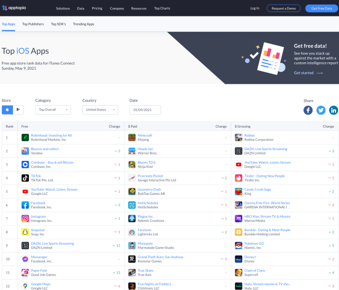 The company also sees a broader future in making its app data more accessible. Last year, for instance, it partnered with Bloomberg to bring mobile data to investors via the Bloomberg App Portal on the Bloomberg Terminal. And it now works with Amazon’s AWS Data Exchange and Snowflake to make access to app data available in other channels, as well. Future partnerships of a similar nature could come into play as another means of differentiating Apptopia’s data from its rivals.