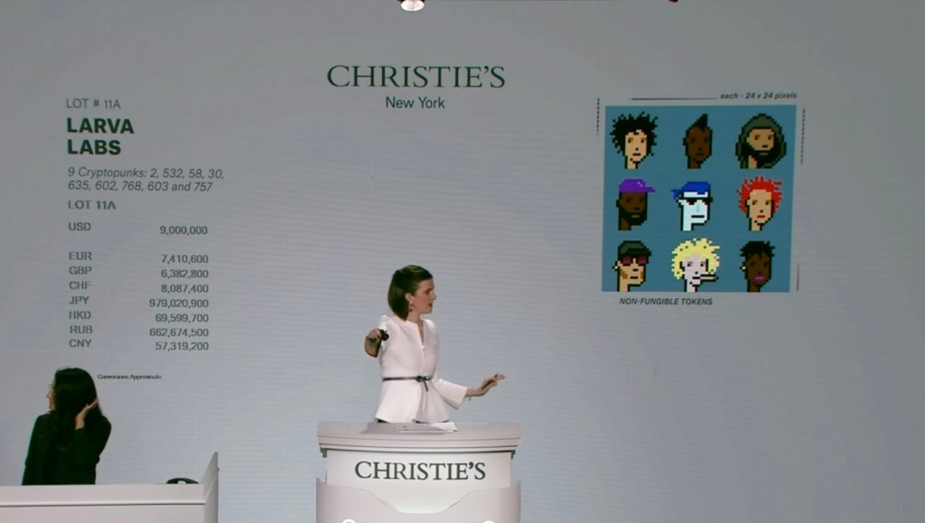A lot of 9 CryptoPunks portraits ended up selling for just under $17 million in a Christie’s auction Tuesday evening, marking another substantial moment for NFT art sales. The lot of pixelated portraits were from the collection of the NFT platform’s co-creators Matt Hall and John Watkinson.