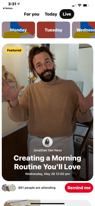 In total, Pinterest will feature around 21 creators throughout the three-day event, with around seven different sessions per day. Users will be directed to the live event via a new “Live” tab inside the Pinterest app for iOS and Android, where they can view the schedule and join sessions.