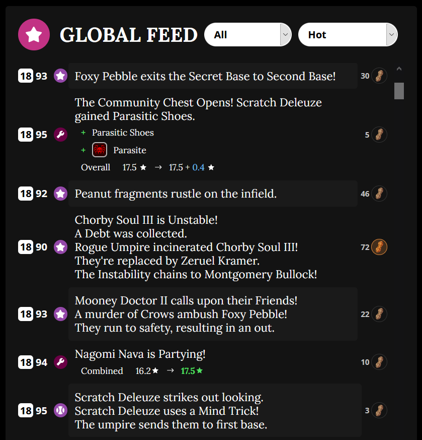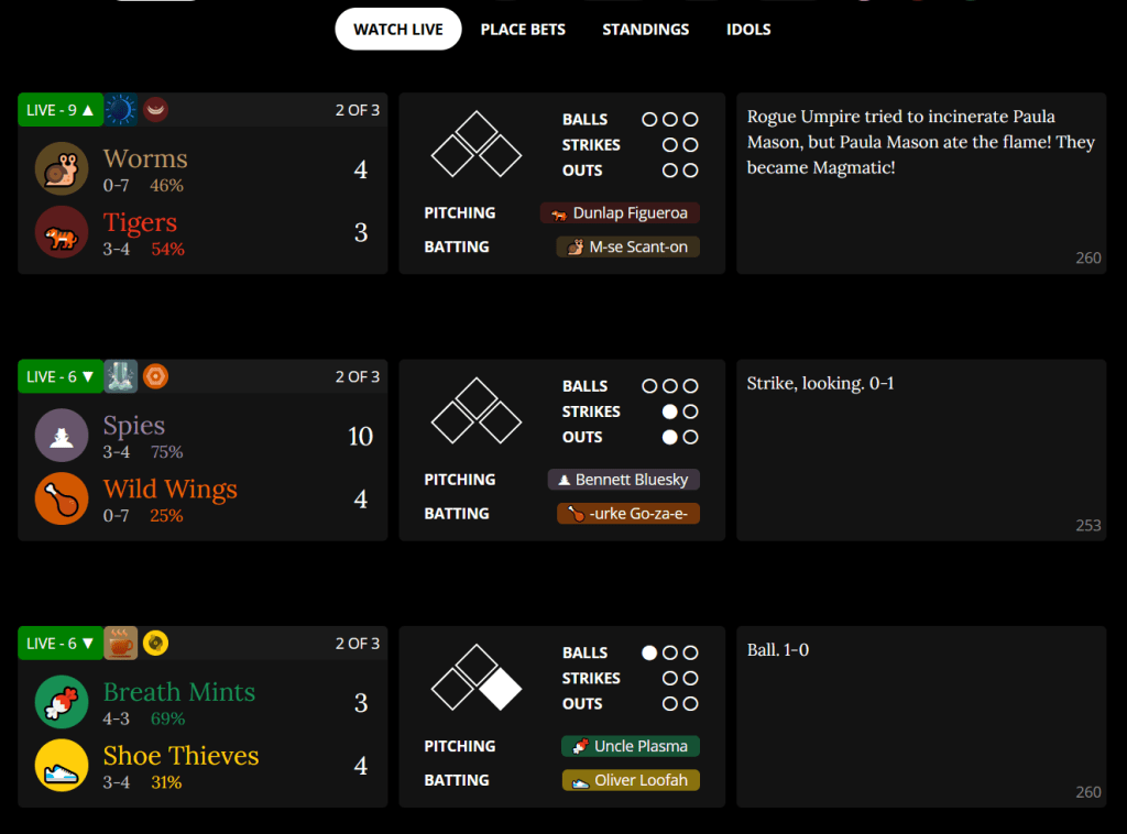 While the resulting game-like product bears some resemblance to baseball, betting and fantasy leagues, it’s much too weird and random to really be considered the same thing. That’s led to some friction as players who expect a more traditional experience lose coins on a game decided by, say, a bird pecking their team’s star hitter inside an enormous peanut shell, or a guaranteed home run because the batter ate magma.