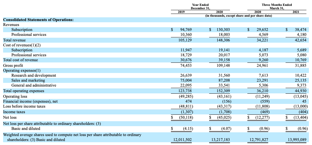 As we can quickly see, WalkMe’s net loss improved from 2019 to 2020, but worsened slightly in gross dollar terms when we compare Q1 2020 to Q1 2021. Our perspective is that the sharpest rise in spend in Q1 2021 was G&A, which sounds to us like a company bulking up its finance operation ahead of an IPO. Or something else, but either way the company’s losses are generally trending down while its revenue rises. That’s good. Everyone loves operating leverage.